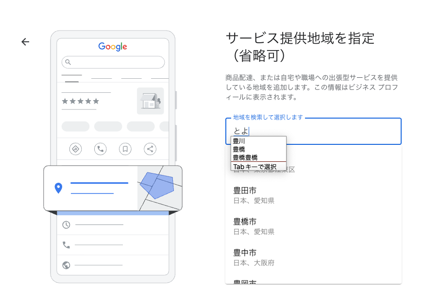 サービス提供地域: その代わりに、自分が動けるエリア(豊橋市、豊川市など)を登録することで、その地域の地図にあなたのビジネスが表示されるようになります。
