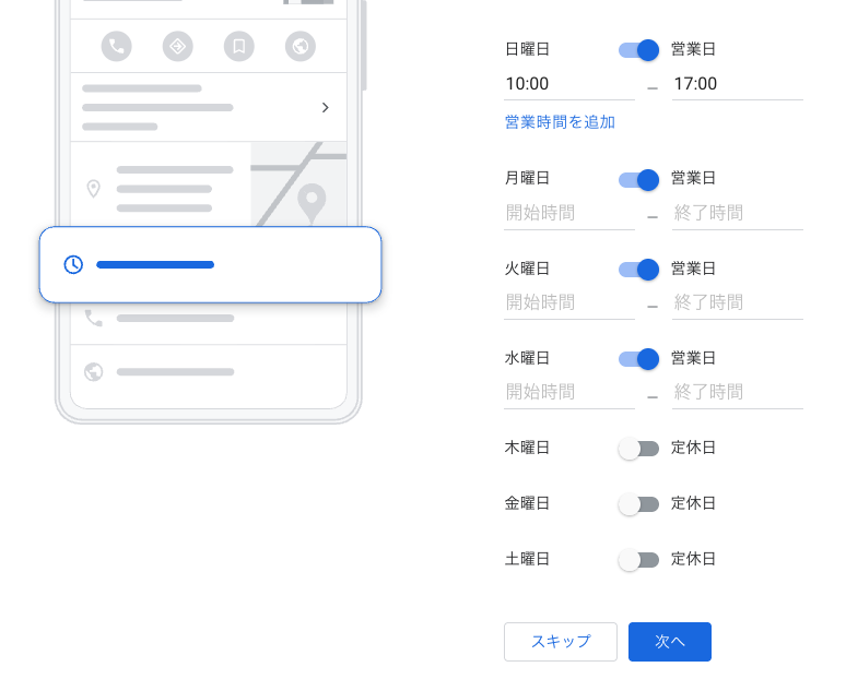 やっている曜日と時間を入力しましょう。(不定休の場合は、スキップでもOK!or固定で営業している日のみ入れておけばOK)