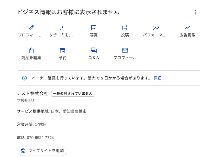 これはGoogle側で、入力された情報が正しいか審査している「登記待ち」の状態です。