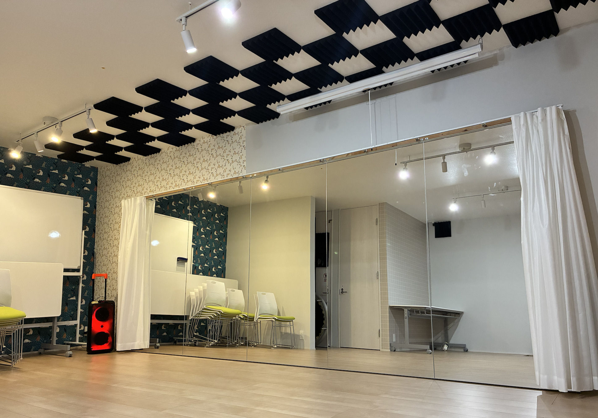 延べ面積約30㎡、1.8m×4.5mの大型鏡設置、〜10人利用向け、wi-fi完備、テーブル(3人がけ用2つ)、椅子10個、ホワイトボード1台、プロジェクター1台、マイクセット1つ、Bluetoothスピーカー、タップダンス用ベニヤ2枚(約1.8m×0.9mが2枚)、プロジェクター用スクリーン、延長コード1つ、水洗洋式トイレ(男女兼用)、入退室管理用カメラ、電源コンセントHDMIケーブル、フローリング、レーザーポインター、三脚、駐輪場、駐車場(1台無料、2台目以降は要相談)、更衣室