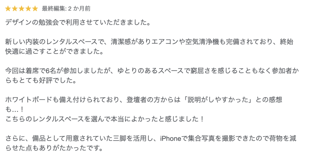 ・プロジェクターや三脚もあるので自撮り、ちょっとしたワークショップ、セミナーにも対応