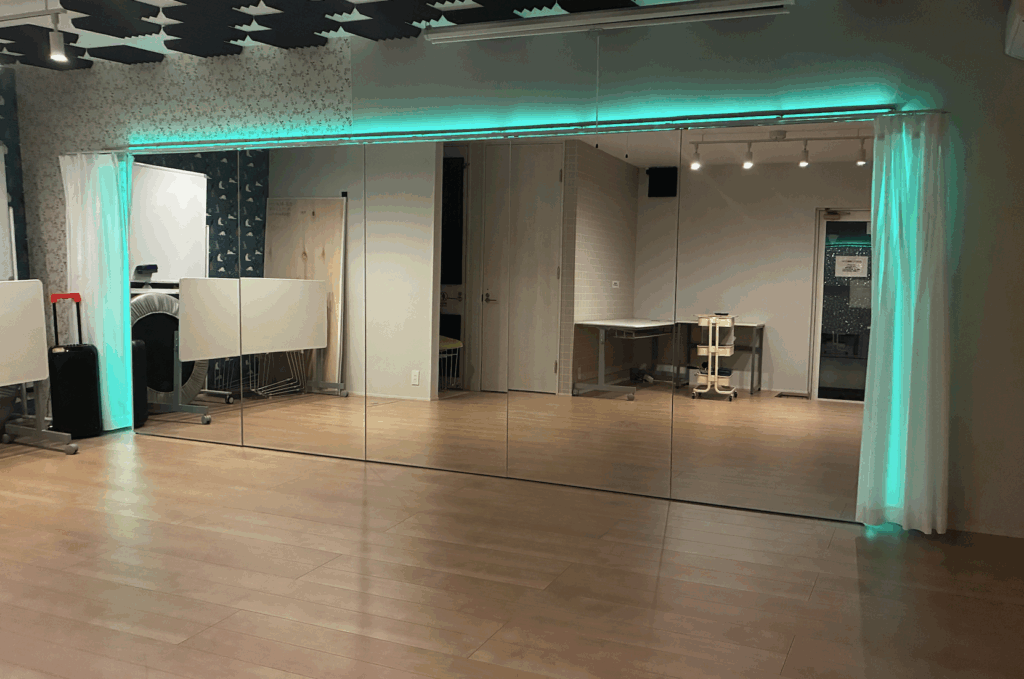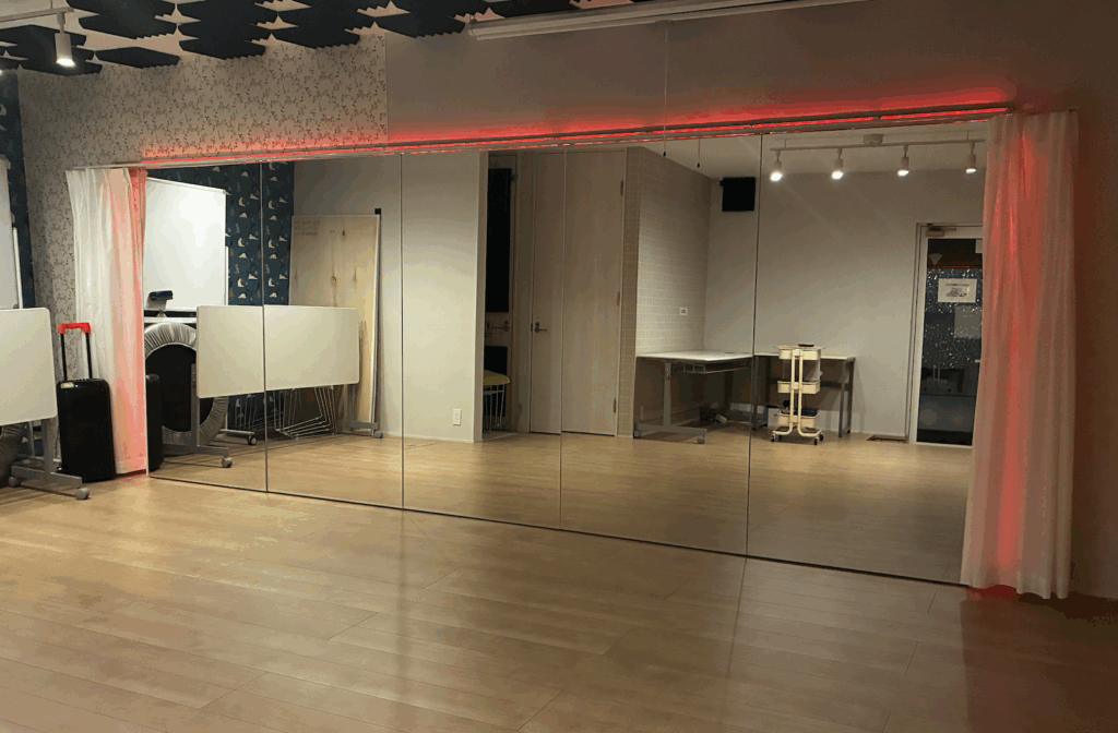 1.8m×4.5mの大型鏡、wi-fi完備、テーブル(3人がけ用2つ)、 トランポリン、椅子10個、ホワイトボード1台、プロジェクター1台、マイクセット1つ、Bluetoothスピーカー、タップダンス用ベニヤ2枚(約1.8m×0.9mが2枚)、プロジェクター用スクリーン、延長コード1つ、水洗洋式トイレ(男女兼用)、電源コンセント、HDMIケーブル、レーザーポインター、三脚、駐輪場、駐車場(1台無料、2台目以降は要相談)、更衣室