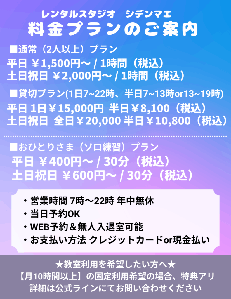 レンタルスタジオ「シデンマエ」のご予約・お問合せは公式LINEからお気軽にどうぞ!